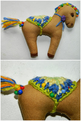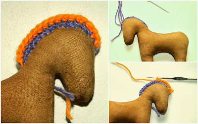 Гриву шью шерстяными нитками, сначала шов через край, а за тем крючком 1.5 вяжем столбиками б.н. меняем нитку 2 раза.