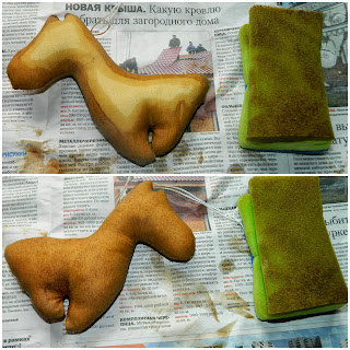 Берем наших светлых лошадок и начинаем тонировать губкой, губку макаем в раствор отжимаем, начинаем тонировать проходя по всем швам стараемся силтьно не мочить иначе будут не красивые подтеки и кляксы при намокании синтепона внутри!!!Делаем все быстро!!!