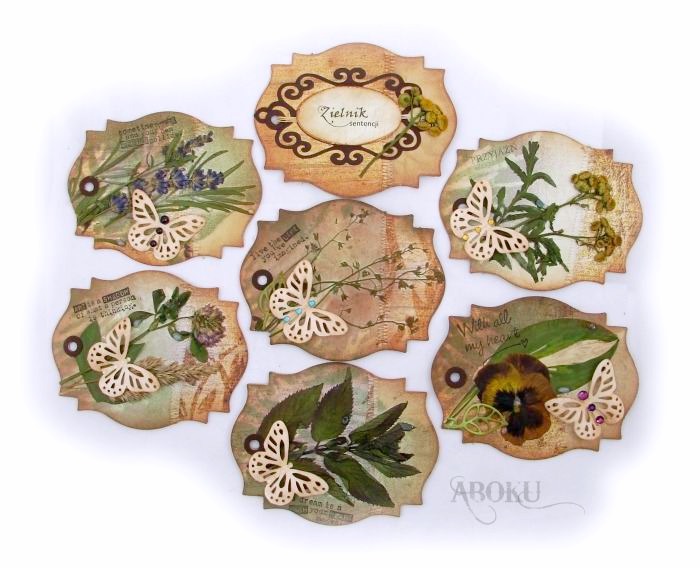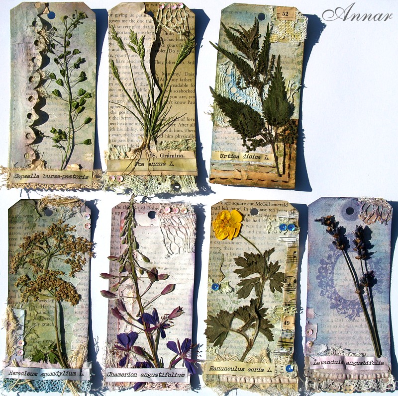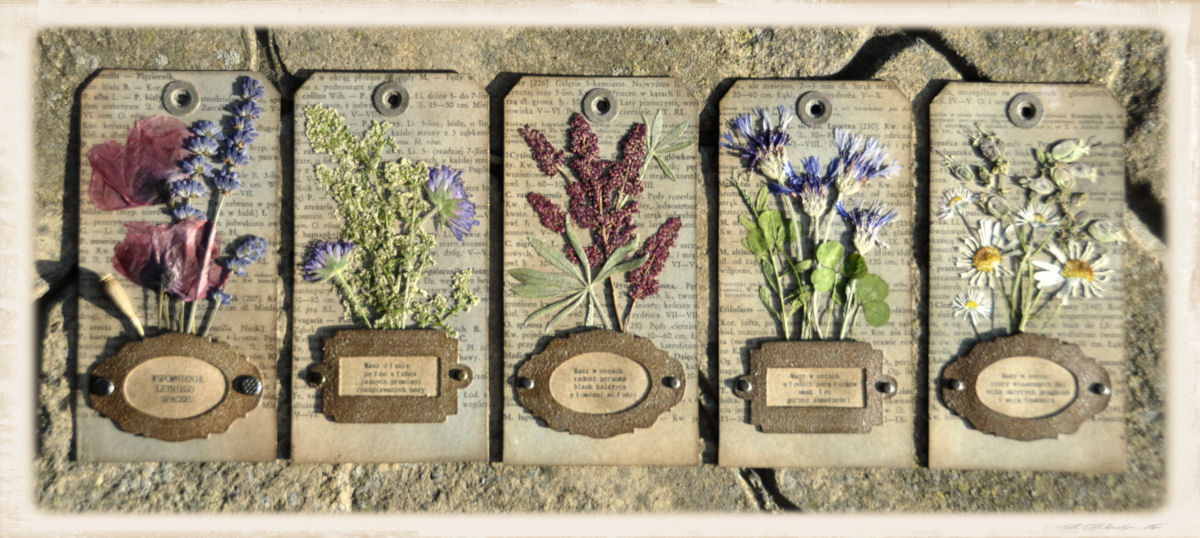 На самом деле мастерицу зовут Катерина - Katarzyna, но она это имя не любит и ее называют Мишель:) Мечтает о жизни в сельской местности, обожает животных - сейчас у нее живут собака, кошка, две морские свинки и кролики:) Не представляет себе жизни без книг, при этом она еще и увлеченный садовод - готова копошиться в саду при любой погоде. Занимается скрапбукингом, декупажем, шитьем, вышивкой, вязанием и созданием украшений. Вот такая вот разносторонняя личность:) Я хочу показать вам ее винтажные теги с декором сухоцветами, интересно, что цветы и травки Мишель собирает сама, прогуливаясь со своей собакой по лугам и лесам:) А также подобные работы от других авторов, которые подобрала сама Мишель. Приятного просмотра!