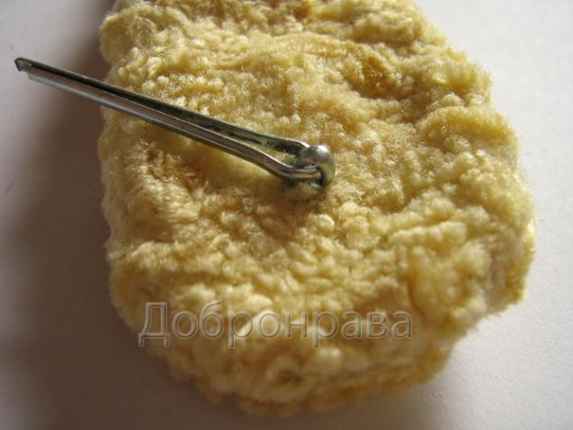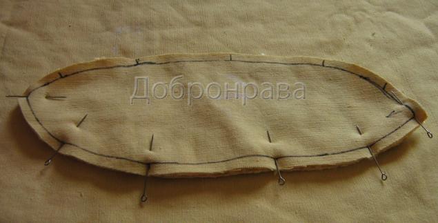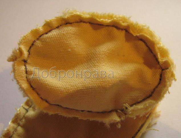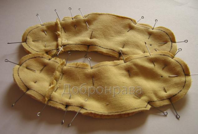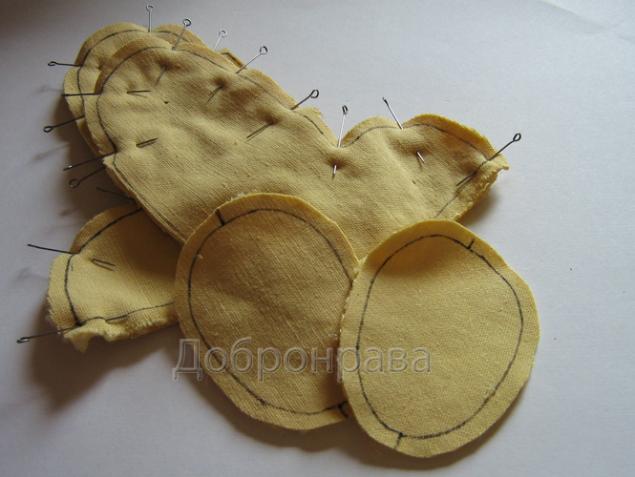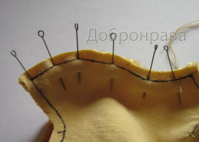 Теперь пришла очередь ушек. Скалываем равномерно распределяя ткань по кругу.