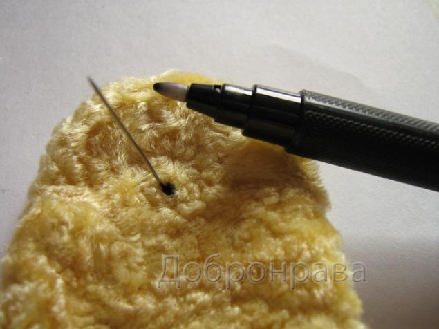 Определитесь с положением глазок. Походите по блогам с мишками, сходите на ЯМ в раздел Мишек Тедди, короче, выберите место куда вы будете ставить глазки. Постарайтесь, как можно более симметрично поставить в эти места булавки. А теперь отметьте эти места маркером и можете убрать булавки.