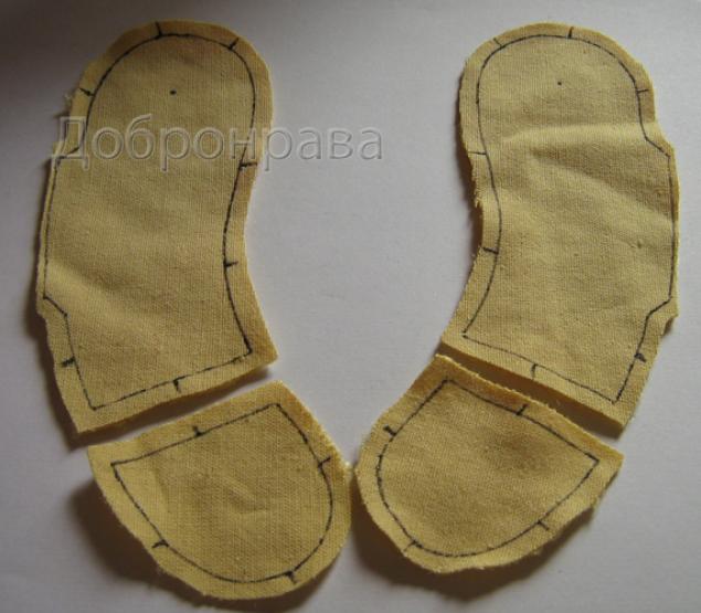 Кроим все детали соблюдая направление ворса и долевой нити. Отмечаем все метки, не забудем о точках крепления рук-ног. Поставьте маленькие стрелочки в верхних точках всех деталей, так вы не запутаетесь и не сошьёте верх с низом, а такое случается.