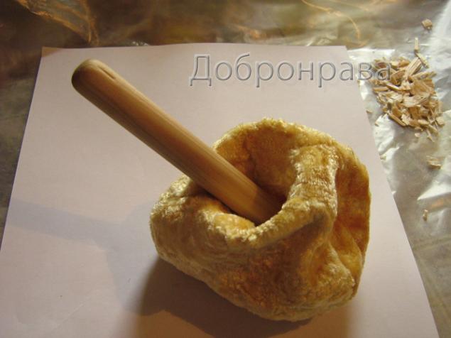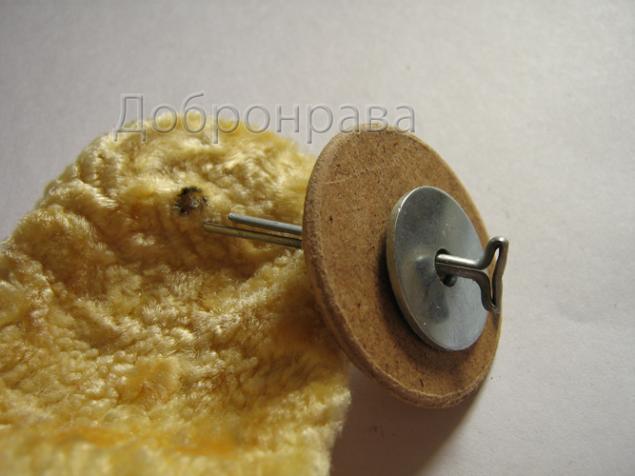 Теперь добейте голову до конца, хорошо утрамбуйте опилки в отверстии. Ткань должна смыкаться, чтобы вошёл диск из оргалита.