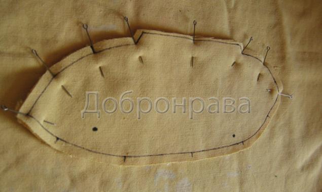 Будем ставить глазки. Для этого мы должны наметить их местоположение. Я это делаю булавками, к своему сожалению фотографии не получились, но это не принципиально. Плохое фото я всё же выложу(
