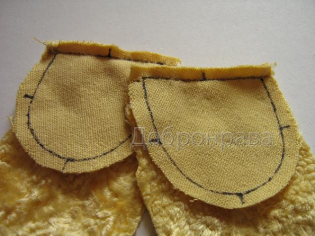 Вы решили какие у вас будут ушки внутри? Не у вас конечно, у вашего мишки))) Их можно сделать из основной ткани, а можно из ткани компаньона. У меня будут из того же плюша, что и весь мишка. Можно было обойтись и без этих "изысков", но всё же опишу. Выкройка внутренней части ушка должна быть меньше чем внешняя. Это для того, чтобы с лица мишки был виден ободок внешней части ушка. Для этого производим следующие манипуляции. Обводим выкройку ушка на основной ткани и обводим припуск на шов. Для внутренней части обводим так же выкройку, но не делаем припуск, а напротив рисуем внутри небольшой припуск и вырезаем по выкройке. Так же можно сделать внутри ушка выточку, но это по желанию, с выточкой внутренняя часть не будет некрасиво выворачиваться, но я обычно обхожусь без выточки. Снизу можете не прибавлять на шов. там есть хороший запас для подшивки.