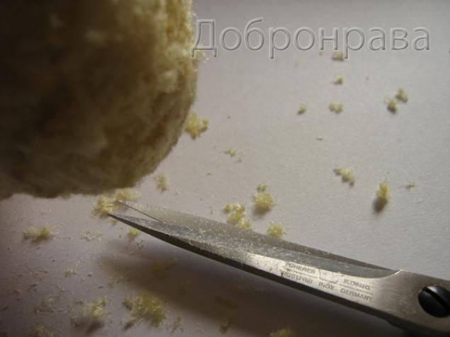 Набиваем помогая себе подручными средствами. Начинаем с носика, но не пытайтесь сразу набить его плотно, не получится, набейте как выйдет, а потом набивайте голову, утрамбовывайте опилки при помощи пальцев и палочек После того, как голова будет приобретать форму, добивайте нос, а то потом к нему не подлезете ничем. Не спешите, иногда откладывайте голову, потом беритесь за неё снова, прощупывайте её, ищите провалы палочкой, только аккуратно, не порвите ткань, делайте это тщательно. Когда голова уже будет достаточно плотно набита, руками формируйте её, правьте форму носика и следите за симметрией. Голова должна получиться круглая и гладкая.