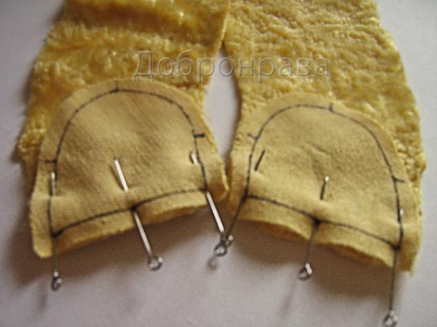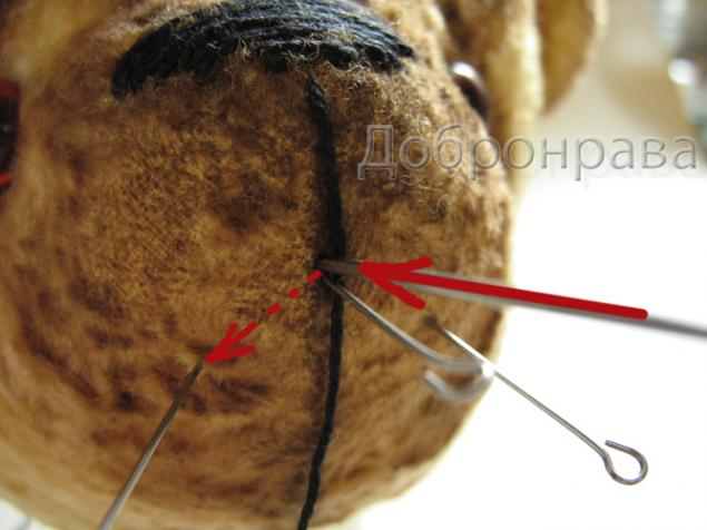 А теперь мы вышьем мишке коготки. Поставим булавки. Следите, чтобы было симметрично, делайте сразу обе руки или обе ноги.