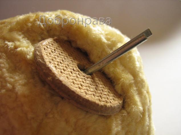 Сначала мы поставим голову. Для этого нам понадобится сама голова, сшитое тело, один диск из оргалита и шайба. Вставляем шплинт в отверстие которое мы оставили при шитье тела, подлазим внутрь тела, надеваем на шплинт диск из оргалита, он должен соответствовать размеру диска, который стоит у мишки в голове и металлическую шайбу. Теперь закручиваем "барашек".