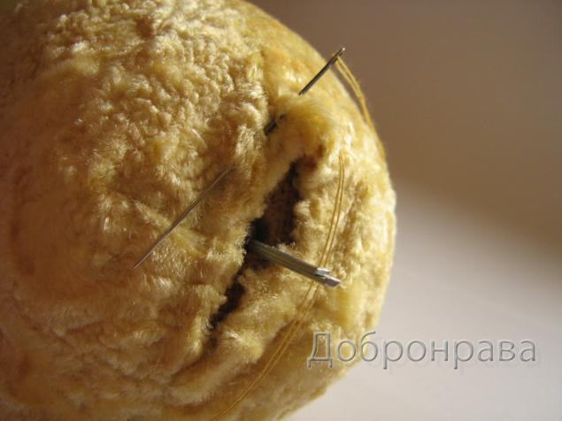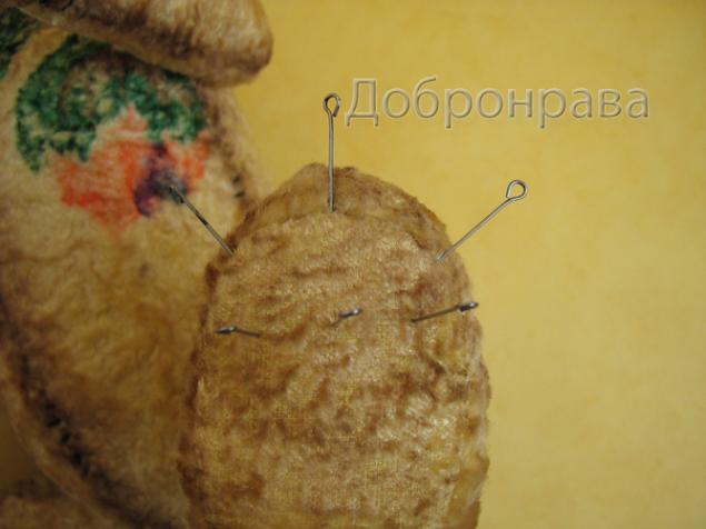 Я ставлю глаза притягивая их на место ушек. В этот раз мне повезло и я буду уши ставить в область перекрестий верхних выточек на голове мишки. Ставлю там булавки, они больше для вас, для наглядности...