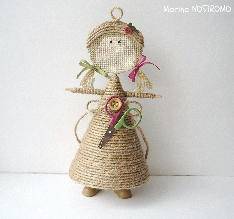 Сложно однозначно сказать что это: оберег, органайзер-игольница (в бечёвку можно втыкать иголки и булавки, а на ручки повесить ножнички или бобинки с нитками), игрушка, или просто декоративная штучка...