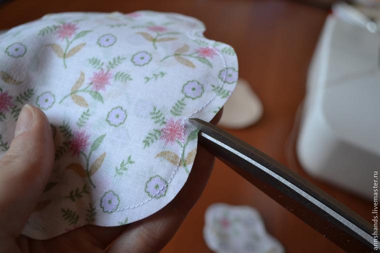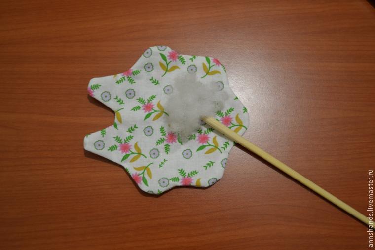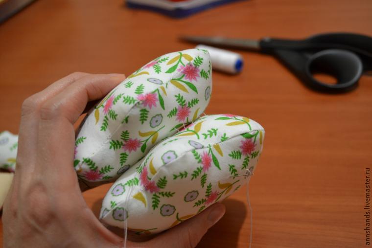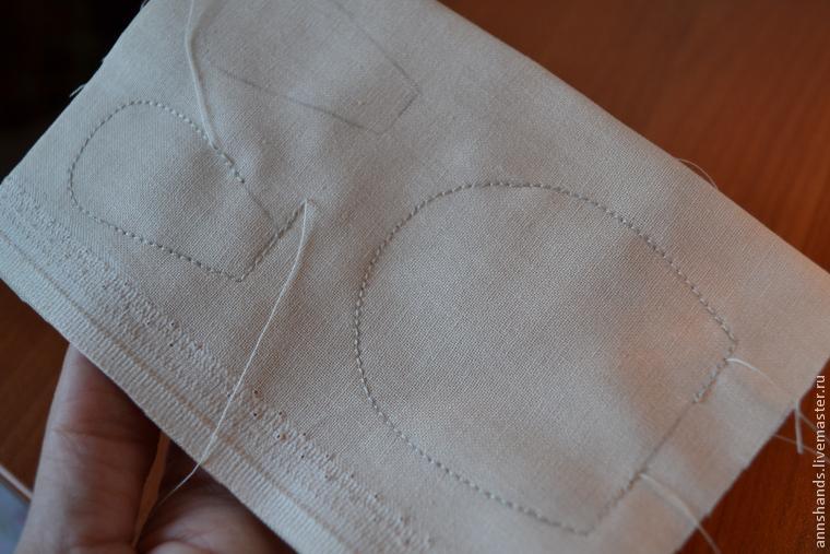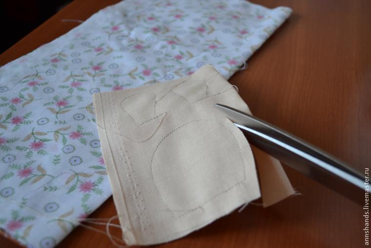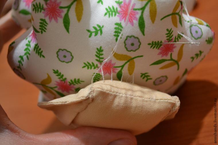 12. Выбираем для себя приемлемый диаметр — так, чтобы разрез, через который выворачивали игрушку, оказался внутри прошитого круга. Сшиваем потайным швом, периодически контролируя, чтобы детали располагались симметрично.