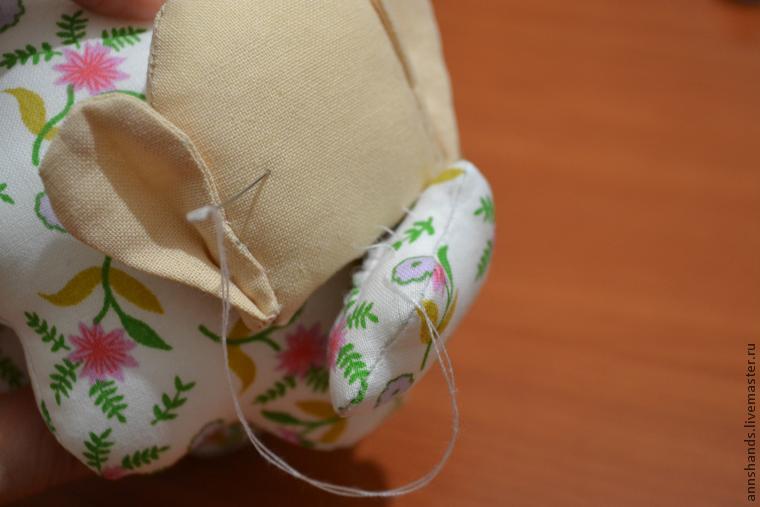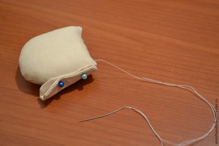 Прикладываем ушки к боковым сторонам мордочки, закрепляем булавками в нужном положении и пришиваем потайным швом — начиная с верхней части, затем по бокам до середины ушка. Чем больше будут пришиты ушки по бокам, тем больше они будут прилегать к мордочке, чем меньше — тем больше они будут топорщиться в стороны.