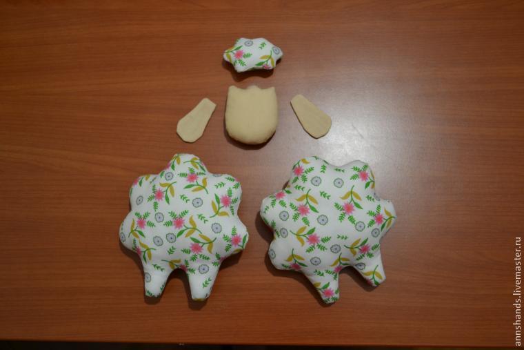 3. Прошиваем по контуру две детали ушек и мордочки овечки, оставляя незашитыми среднюю часть верха мордочки и верхнюю половину одной стороны ушек. Вот так, как на фото.