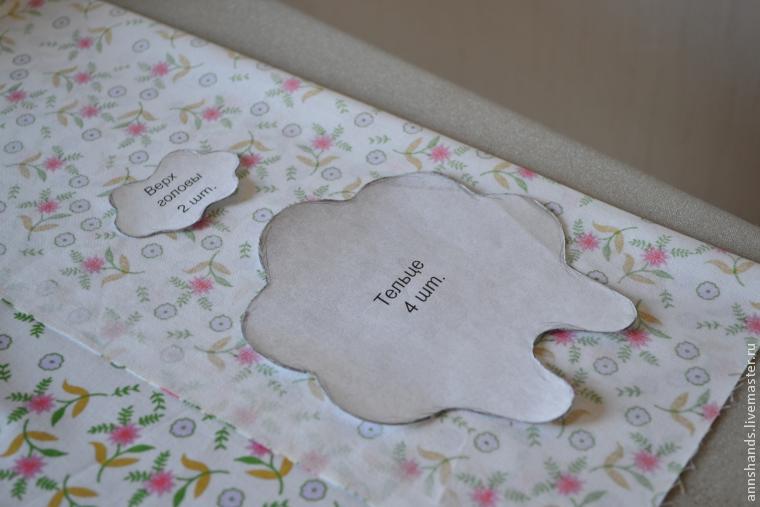 1. Проглаживаем обе ткани, складываем их лицевой стороной внутрь. Переносим на цветную ткань детали тельца и верха головы, на однотонную — детали мордочки и ушек овечки.