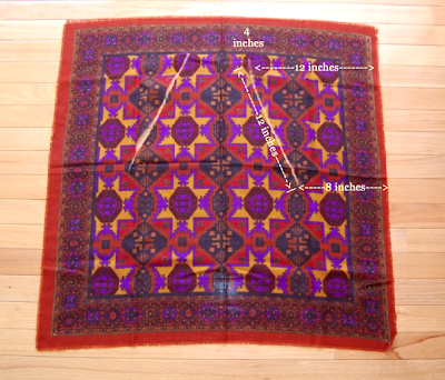 I eyeballed this and didn't measure anything before hand, but I understand that's not everyone's style. SO if you're still hesitant, check out the diagram below. I included measurements for my particular vest, but keep in mind that it was done on a 30x30 scarf. You can always adjust accordingly depending on the size of your scarf.