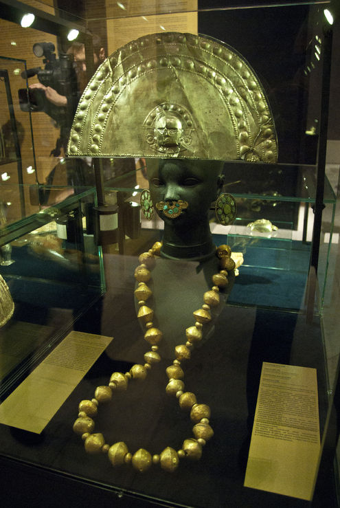 Что там можно увидеть? Как и обещали, золото, еще, в меньшем количестве, серебро и чуть-чуть керамики. Короны, серьги, бусы, ритуальные сосуды, ножи, погребальные маски, и еще более удивительные вещи, такие, как пинцет для удаления волос размером с лопатку для торта и сумочка для ношения листьев коки, имеющая вид расплющенного кота с вытянутыми лапами и хвостом. Разнообразные коты и ягуары украшают многие предметы на этой выставке, видно, древние индейцы уважали кошек. Не обидели и других представителей местной фауны: ламы, тропические птицы, жабы тоже были отлиты из золота или выдавлены на листах золотой фольги. Древние мастера не экономили на благородном металле, если корона, то высотой с голову, если серьги, то размером с кофейное блюдце, а бусины уж никак не меньше грецкого ореха. Можно только попытаться вообразить, как все это роскошество на индейских жрецах и вождях блестело и сияло, да еще и звенело при движении, потому что и короны, и прочие украшения в тех краях было модно снабжать болтающимися висюльками. Конечно, не заметить человека в таком убранстве никак не возможно. Впрочем, должна сказать, что есть среди экспонатов и довольно изящные вещицы, небольшие и очень искусно сделанные. Когда перечисляла украшения, забыла упомянуть украшения для носа, и это не скромные колечки или гвоздики, а пластинка, обычно прямоугольная, размером с социальную карту, разукрашенная зверями-птицами, крепится с помощью зажима на носовую перегородку. Можно ли было с этой штуковиной есть-пить и не мешала ли она дышать? Не знаю.