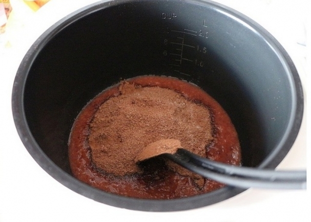 5. В сливовую массу добавьте какао порошок и сливочное масло. Варите, постоянно помешивая, чтобы не было комков.