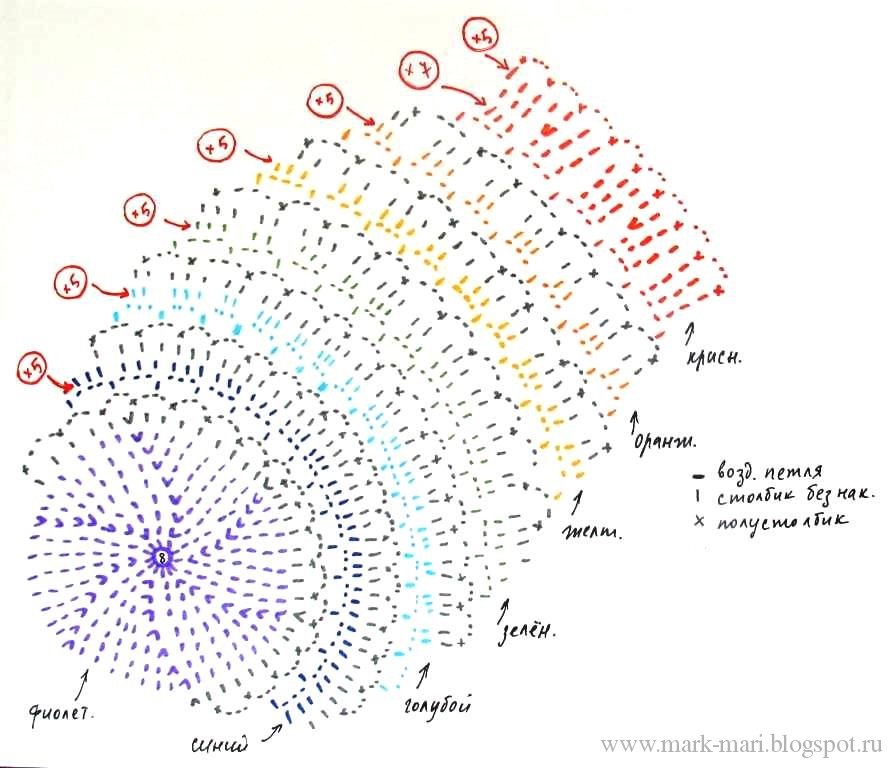 Цветные полосы лучше вязать по спирали, чтобы не было видно "шва". Нить по окончании вязания каждой из полос лучше обрезать и маскировать внутри по ходу вязания, чтобы не делать некрасивых перетяжек внутри. Готовые панамки постирайте в стиральной машине при 30 градусах и отожмите на больших оборотах. Высушите, спрячьте и обрежьте все кончики нитей на изнаночной стороне. Прогладьте шапочки с паром с обеих сторон. Слегка растяните поля. Готово! Можно надевать. Или вы свяжете "Радуги" в подарок? :-)