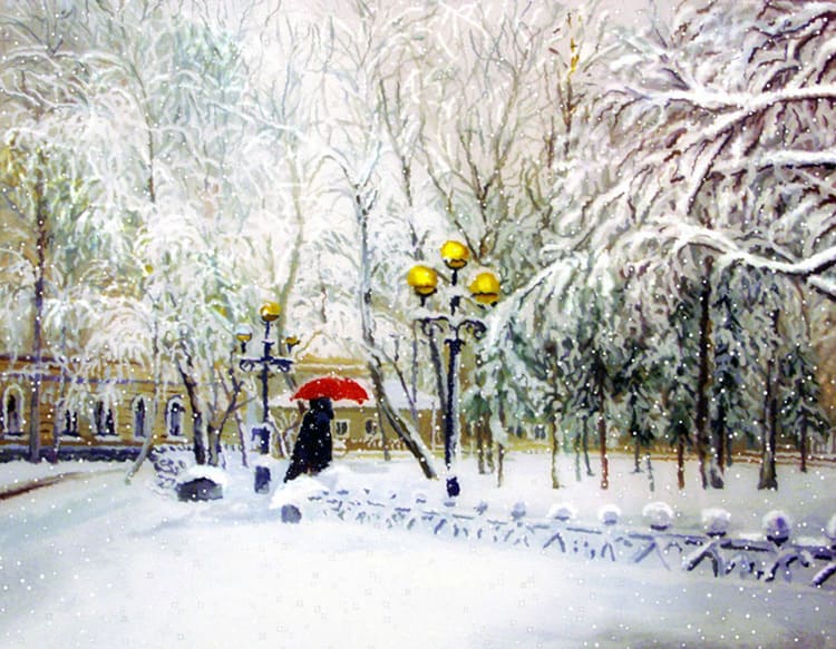 Но сквозь сеть нагих твоих ветвей Никогда бледней не стыла просинь, И снегов не помню я мертвей. | И черней твоих не видел вод, На твоём линяло-ветхом небе Жёлтых туч томит меня развод. |