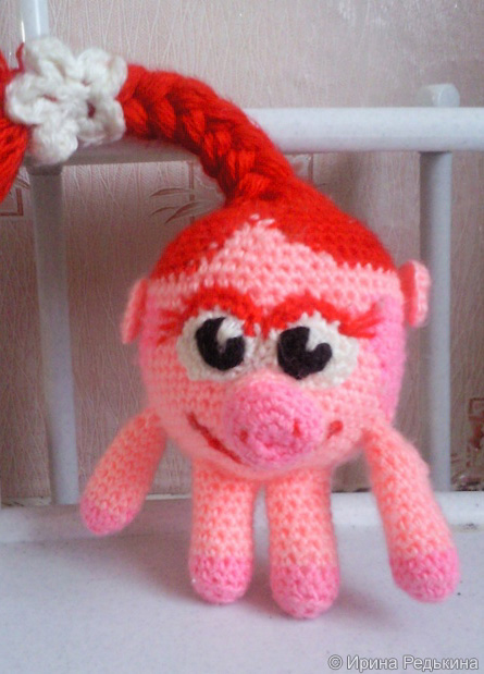 3. На макушке закрепить волосы из красной шерстяной пряжи и заплести их в косичку. Пришить к косичке цветочек.