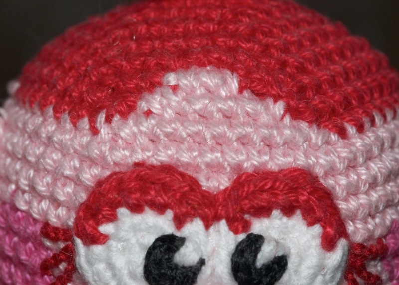 19 ряд: перейти на вязание красной нитью и провязать без прибавок. В области лица необходимо вывязать “пробор” (см. по фото), для этого 9 ст. б/н провязать розовой нитью [= 54 ст. б/н].