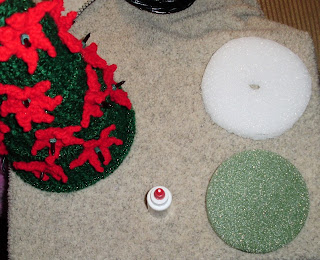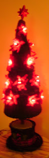 Before I put the lights in, I sewed the poinsettias onto the tree. This could have been a big mistake, since I didn't take into account the distance between each light bulb -vs- the distance I had sewn on each poinsettia. But fortunately all of the lights were able to reach the centers of eack poinsettia as I had planned.