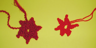 First I started by deciding on how I wanted the poinsettias to look. I created them all in one piece, using the flower loom and Homespun candy apple red yarn. But they came out looking more like a star (the one on the left), and they weren't the right color. I tried again, increasing the number of leaves and using red heart red yarn. Now it looked more like a poinsettia to me (the one on the right):