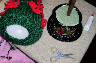 To assemble the tree, I purchased a clear plastic cone from an online craft store to use as the inside of the tree, because I knew styrofoam wouldn't work well with the lights. Plus I didn't want the color of the styrofoam to show through the knitting. I bought a wood dowel and painted the bottom part of it brown, to use as the tree trunk. I bought a strand of 20 red Christmas lights. Then I bought some styrofoam discs that I would cut to insert and glue inside the bottom of the tree and into the base of the pot, to hold the tree steady and upright.