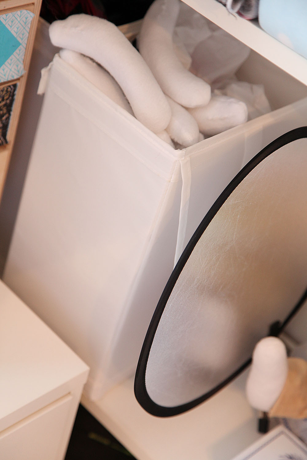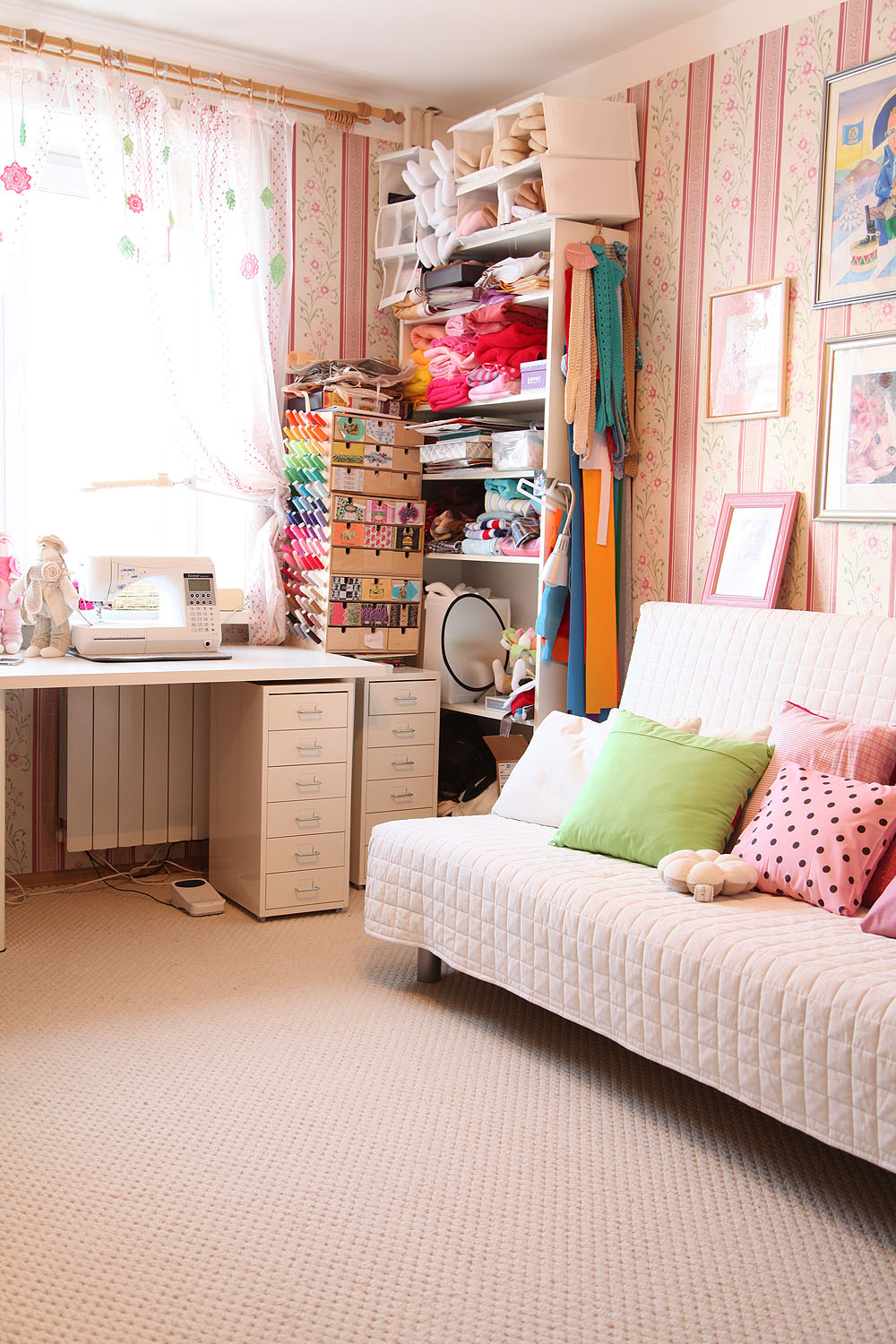 Слева от дивана стоит многофункциональный шкаф. В нем всякое нужное: ткани, заготовки, и много-много всего.