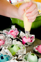 заполняем скорлупки, выложенные в скомканной фольге, при помощи кондитерского мешка.