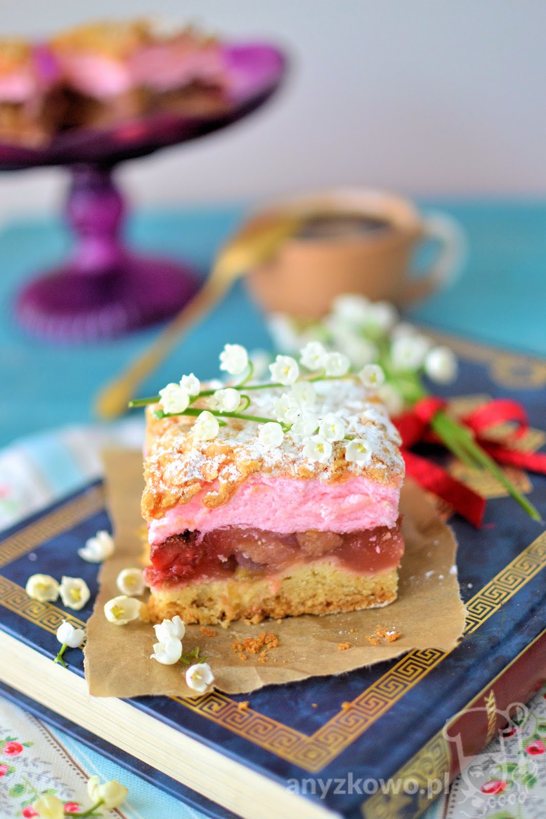 Ciasto z musem rabarbarowo-truskawkowym i z różową pianką |