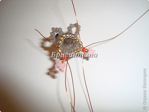 Осталось сделать хвостик. Набираем 17 розовых бисерин и снова пропускаем проволоку через все, кроме последней. Закрепляем проволоку.