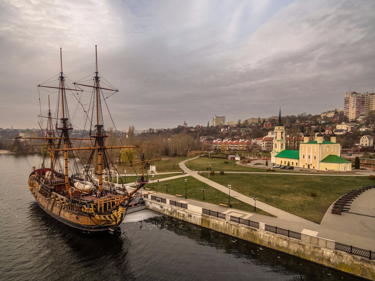Увидеть фрегат с пушками можно во время водных прогулок на теплоходах.