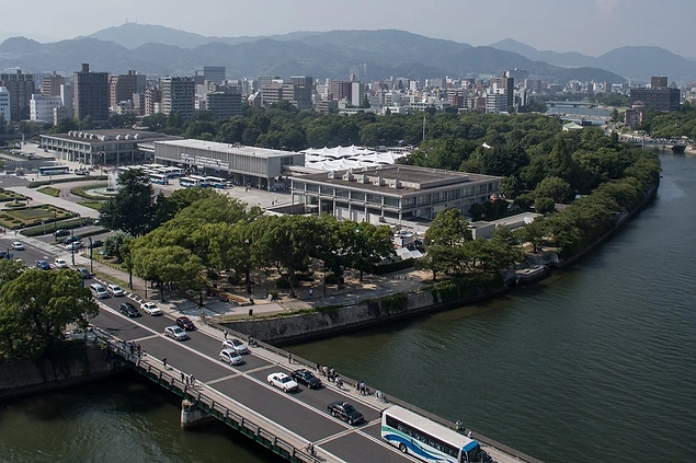 Вид на Мемориальный парк мира в Хиросиме 5 августа 2015 года. Мемориал был построен вскоре после того, как город оправился от ужасного происшествия, недалеко от эпицентра взрыва. В парке имеется музей и ряд монументов.