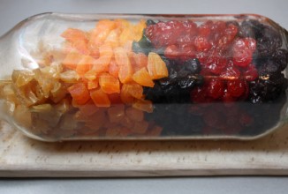 Режем курагу, чернослив и грушу кусочками размером с изюм, складываем все сухофрукты в закрывающуюся емкость и заливаем ромом. Оставляем так на несколько часов или дольше, чтобы ром впитался.