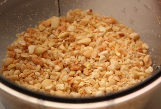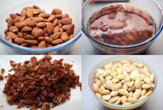 Миндаль заливаем кипящей водой, оставляем не 5 минут, затем чистим и подсушиваем.