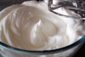 Берем только яичные белки и взбиваем в плотную пену с парой капель лимонного сока и солью.