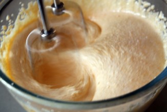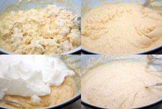В миску с мучной смесью добавляем растопленное сливочное масло, взбитые желтки и хорошо мешаем, а затем осторожненько, за 2-3 раза, вмешиваем белки, сохраняя воздух.