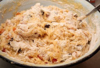Когда опара поднимется, добавляем оставшуюся муку и сухофрукты.