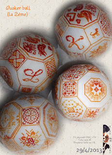 создан из различных мотивов квакерской вышивки, то, при желании, дизайны оригинального набора, можно заменить на любые другие из богатого "квакерского" арсенала. А можно и вовсе составить ансамбль из далеких от квакерского стиля орнаментов и рисунков. Главное, чтобы они вписывались в размер и хорошо сочетались друг с другом. Цвета и фактуру материалов (мулине и ткань) тоже можно варьировать в зависимости от предпочтений. Поступая подобным образом, каждый может создать свой собственный неповторимый мяч... Правда, если слишком оторваться от оригинала, вместо "квакерского мячика" получится просто красивый мячик-пазл... Ну, и прекрасно! Зато, он уж точно будет отражением вашей яркой творческой индивидуальности!