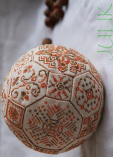 Quaker Ball - это тряпичный мячик, выполненный в стиле Quaker Embroidery ("вышивка квакеров", об истории этой вышивки можно прочитать