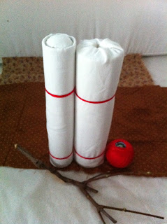 3. Все варианты (кроме берестяной трубочки) теперь требуютобернуть основу белой х/бтканью. Отрываете, предварительно примерив вашу трубочку, оставив с обоих концов небольшие припуски, которые завернете вовнутрь. Аккуратно и плотненько закручиваете трубочку в это материал и повторяете процесс обмотки красной нитью, теперь достаточно шею и ноги только. Но, можете и талию еще раз. Небольшие кончики нитей также только со стороны спинки (помните где она у вас уже наметилась?)