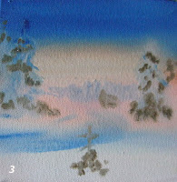 В росписи я всегда начинаю с фона. Небо здесь с растяжкой от насыщенного голубого до совсем светлого, утреннего тона, который может быть желтоватыми, розоватым. Чтобы краска лучше ложилась и не очень растекалась, я покрываю ткань текстурной белой массой, которая на вид очень смахивает на белила. После высыхания она абсолютно прозрачна и абсолютно не оставляет на ткани никаких следов своего пребывания.
