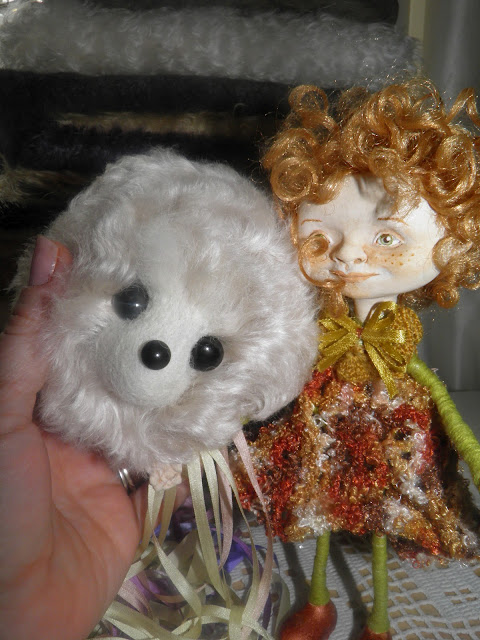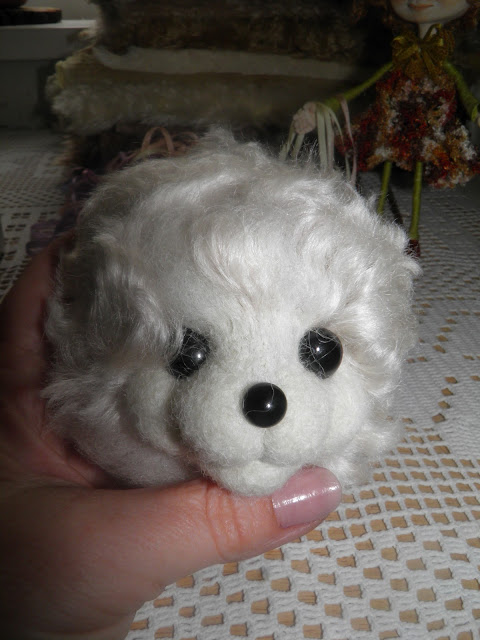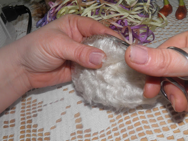 Берем немного кордачеса,и прилаживаем его к подбородку-начинаем приваливать,накрывая шерстью всю бульбу носика