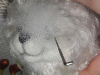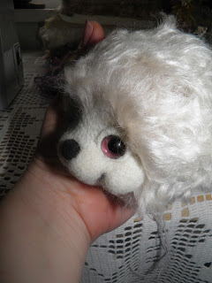 Теперь веки.Это сложно описать...я накрываю глаз полностью кусочком шерсти,пришватываю у начала века,и там где оно заканчивается,приваливаю шерсть вдоль всего глаза,а потом как бы открываю его,вводя иголку вдоль глазика