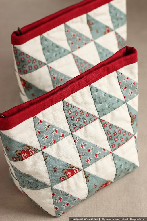 Рисунок из тёмных и светлых треугольников. По периметру светлые треугольники простёганы вручную вощёными нитками в тон. В качестве наполнителя хлопковый объёмный флизелин. Косметички получились плотные, устойчивые и приятно пухлые.
