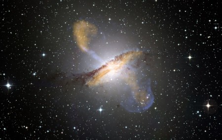 22. Фото галактики Центавр A (Centaurus A), нате котором видно обычную черную дыру. Фото было сделано с помощью трех телескопов, работающих в различных частотных диапазонах.