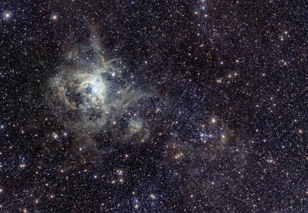 28. На фото изображена туманность Тарантул (Tarantula Nebula) в созвездии Золотая Рыба. В центре туманности находится небольшое скопление звезд R136. Фотография сделано телескопом VISTA.