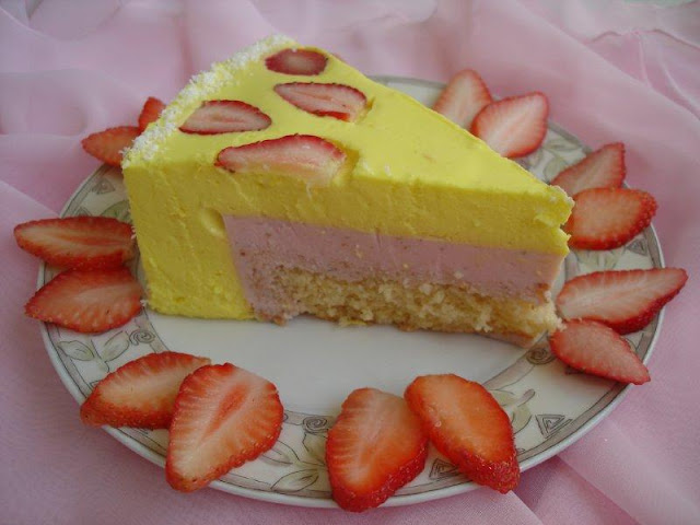 Пы.Сы. Девочки, кому лень заморачиваться, можно просто налить одну массу на другую, используя только одну форму, но мне оч. хотелось попробовать более интересный вариант, когда желтый слой обволакивает розово-бисквитную начинку. Идею взяла с Goodcook.ru.