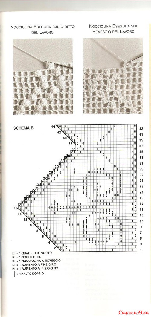 1 aumento a fine giro- 1 добавление в конце ряда( 1 столбик с накидом,2 воздушных петли, 1 столбик с 2 накидами в низ первого столбика с накидом)